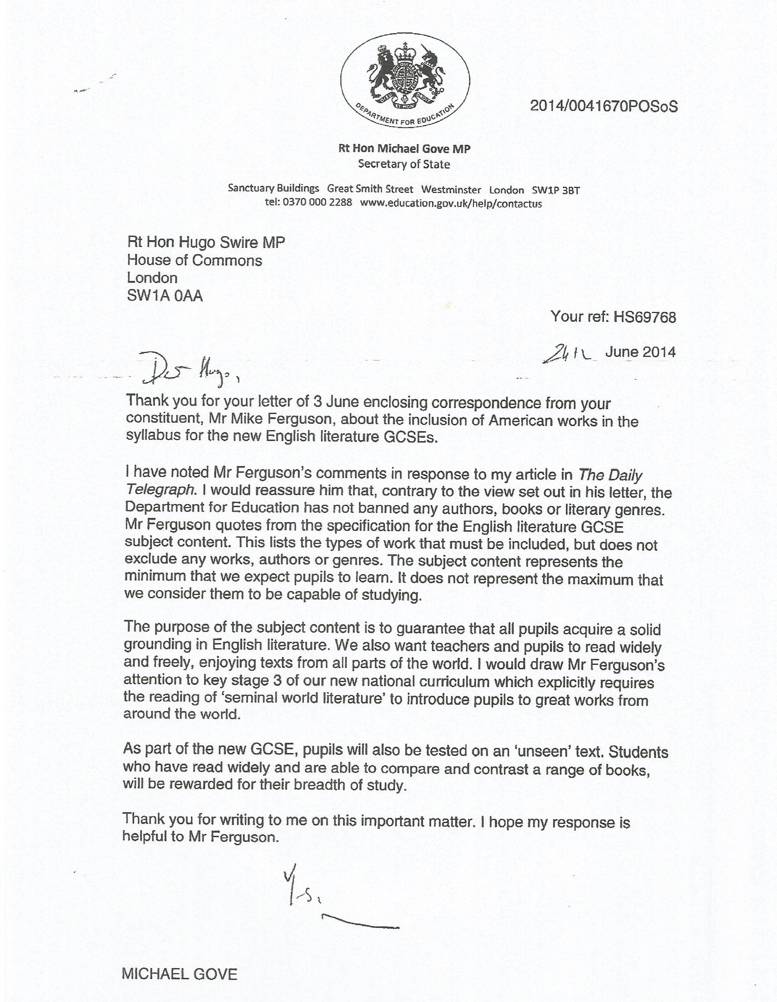 This is the neighing from the horse’s mouth. My local MP had represented my ‘banning American authors query’ in the first instance – thus this response from Gove to him – but I should point out that when I naturally challenged such explanations from this letter again through my MP, he personally responded with more of the above to state he wouldn’t further my questioning because he agreed with Gove, but did so by simply, and blatantly, cut-and-pasting from the DfE/Gove’s justifications – so I stopped that route, and then Gove was gone.