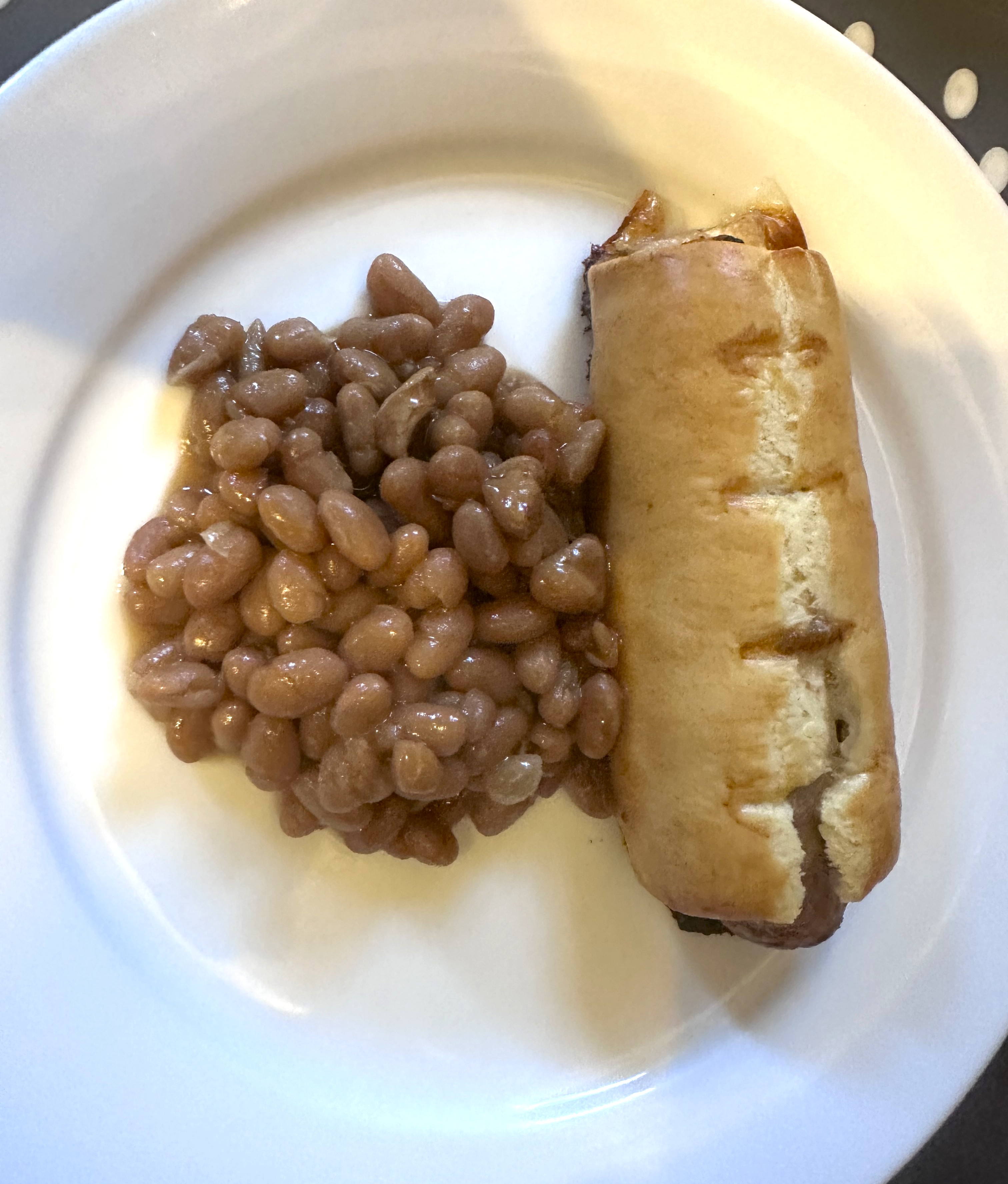 Having yesterday played around with some linguistic siliness about English/American words, I followed this up with an illustrative tea/supper of homemade sausage roll and ‘B&M Original Baked Beans with molasses, pork and spices’. Here is the initial context and prompt: